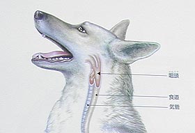 のどの奥のヒダの部分(人間で言うとのどちんこの部分)が垂れ下がり、気道の入り口をふさいでしまう状態になることをいいます。眠っている時に『いびき』をかいたり、呼吸をする時に『ふがふが』言っていたり、水を飲む時にむせたり、といった症状が起こります。